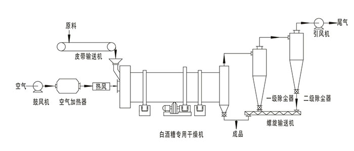 白酒糟烘干機(jī)主要由熱源、上料機(jī)、烘干滾筒、傳動(dòng)裝置等構(gòu)成,濕酒糟送入烘干滾筒,筒體內(nèi)設(shè)有多個(gè)排列為螺旋形的抄板,通過簡體的旋轉(zhuǎn)帶動(dòng)抄板將酒糟不停的揚(yáng)起,筒壁的擊打裝置防止物料粘結(jié)筒壁及抄板,揚(yáng)起的物料與由引風(fēng)系統(tǒng) 傳入的熱氣流充分接觸,加快了烘干傳熱、傳質(zhì),蒸發(fā)水分,完成干燥,由出料口排出。酒糟烘干機(jī)可快速將水分含量在 65%左右的濕酒糟經(jīng)過脫水、烘干至水分含量在10%左右的干品,用于制做高蛋白飼料,實(shí)現(xiàn)了酒糟烘干處理的機(jī)械化、工 業(yè)化、自動(dòng)化。設(shè)備機(jī)械化程度高,生產(chǎn)能力大,可連續(xù)運(yùn)轉(zhuǎn),操作方便,故障少,維護(hù)費(fèi)用低,功耗低。